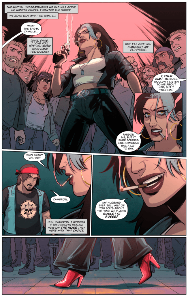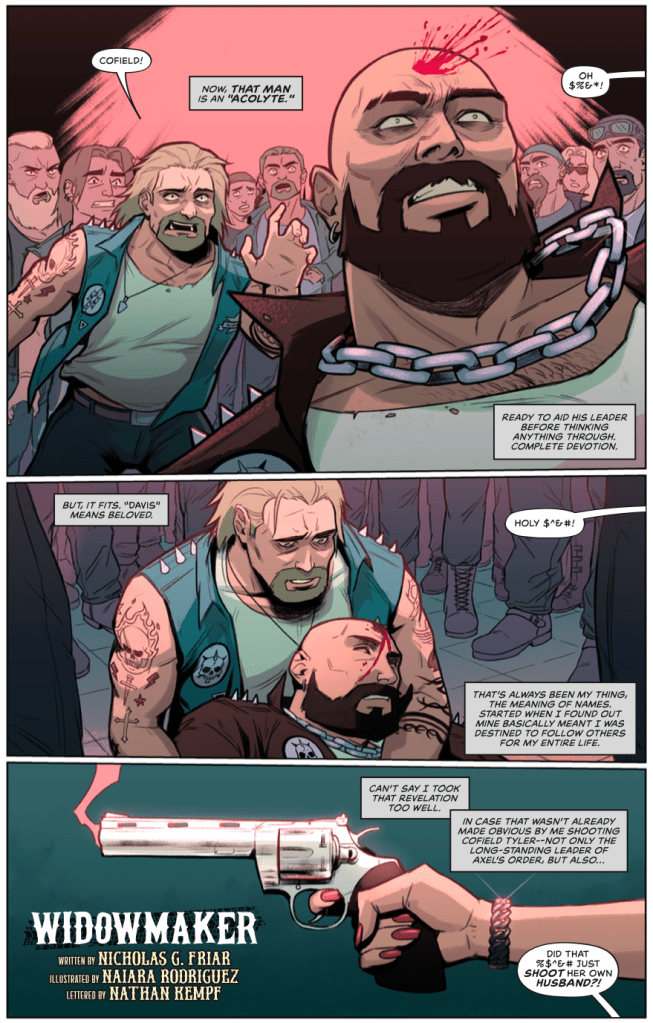 My first published comic book writing was featured in Scott Snyder Presents: The Cloakroom #1. The first 2 pages of my story, WIDOWMAKER, in The Cloakroom anthology can be seen below. (Art by Naiara Rodriguez and letters by Nathan Kempf)